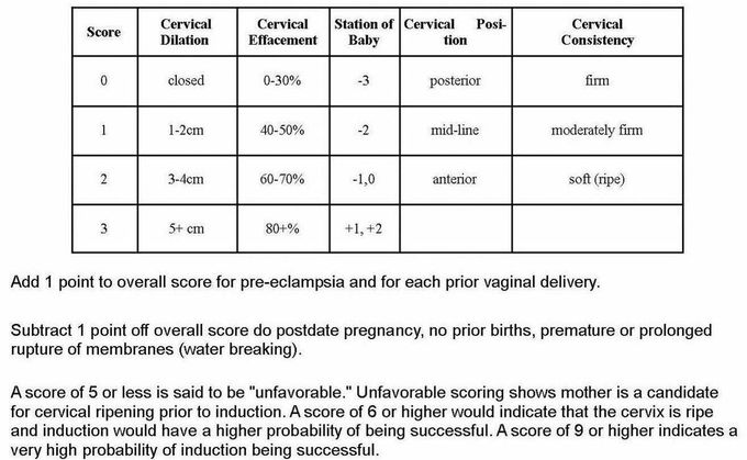 Medications or devices may be used to soften the cervix so it will stretch (dilate) for labor. Your doctor can use the score to estimate the likelihood of a vaginal birth if you need to be induced. The bishop score gives points to 5 measurements of the pelvic examination dilation, effacement of the cervix, station of the fetus, consistency of the cervix, and position of the cervix. The higher the score, the more likely you will have a successful induction. They use it to determine whether they should recommend induction, and how.